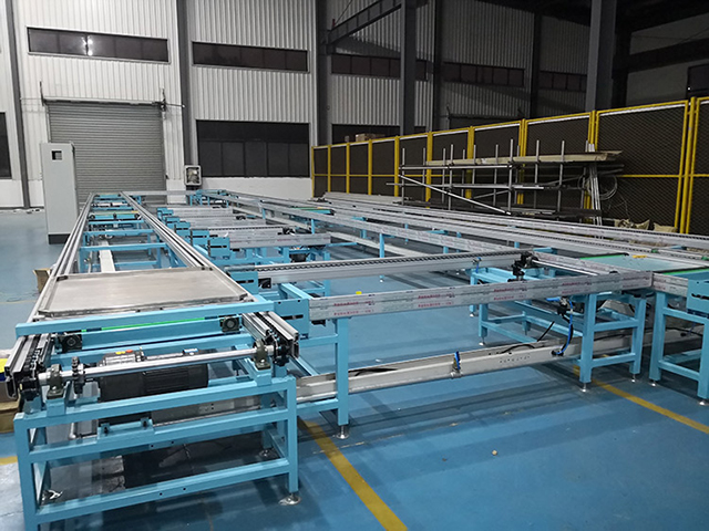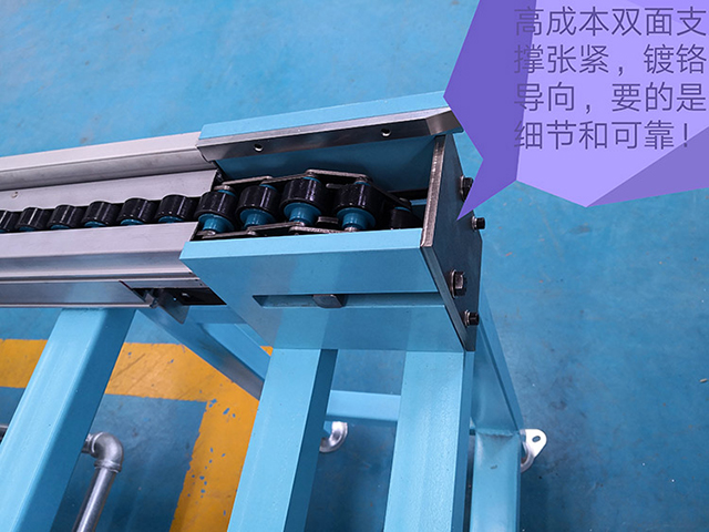 倍(bèi)速鏈生產線主(zhǔ)要用於(yú)裝配及加工生產線中的物料輸送,其輸送原理是運用倍速鏈條(tiáo)的增速功能,使其上承(chéng)托貨(huò)物的(de)工裝板快速運行,通過阻(zǔ)擋器(qì)停止於相應的操作位置;或通過相(xiàng)應指令來完成積放動作及移行、轉位、專線等功能。